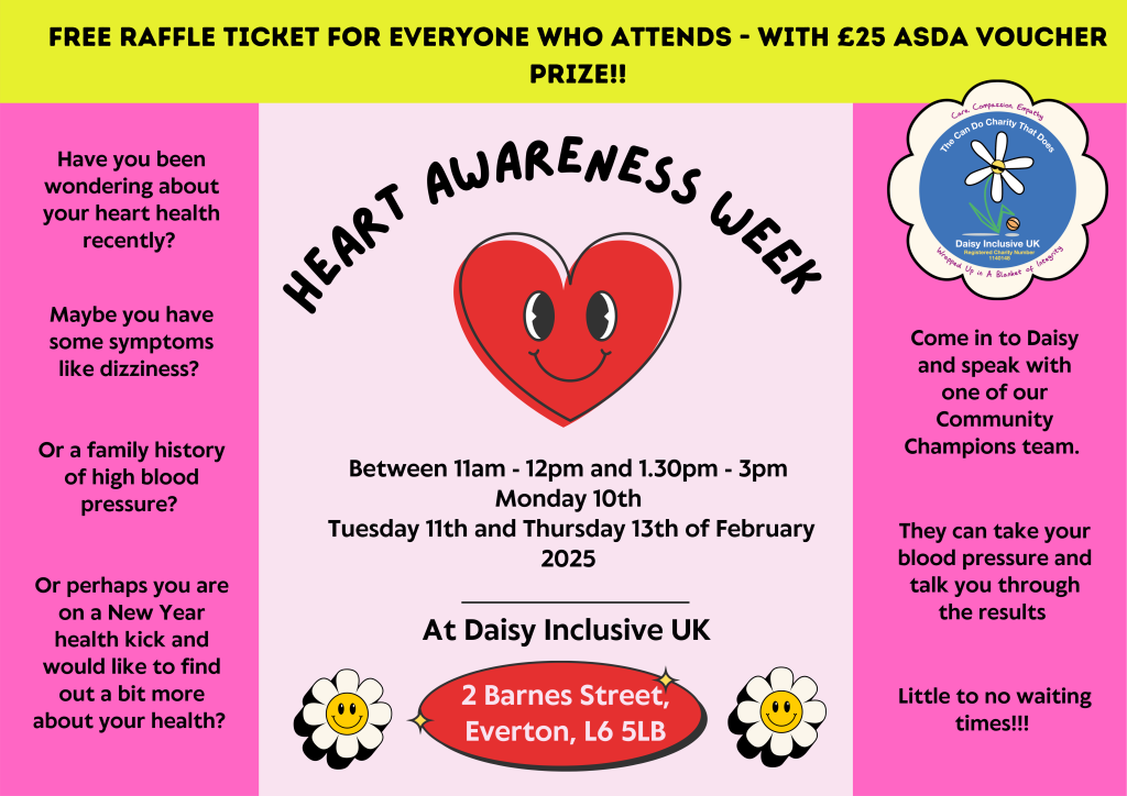 They will take your blood pressure and talk you through the results, so if you have been wondering about your heart health recently, pop into Daisy Inclusive UK on Barnes Street, Everton.